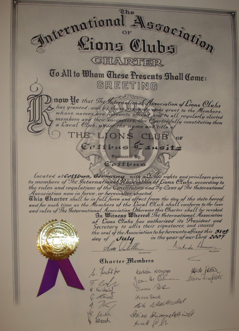 Mit der feierlichen Übergabe der Charterurkunde erfolgte die offizielle Aufnahme in die internationale Vereinigung der Lions Clubs, die größte humanitäre Servicecluborganisation der Welt. (links im Bild unsere Charterurkunde)